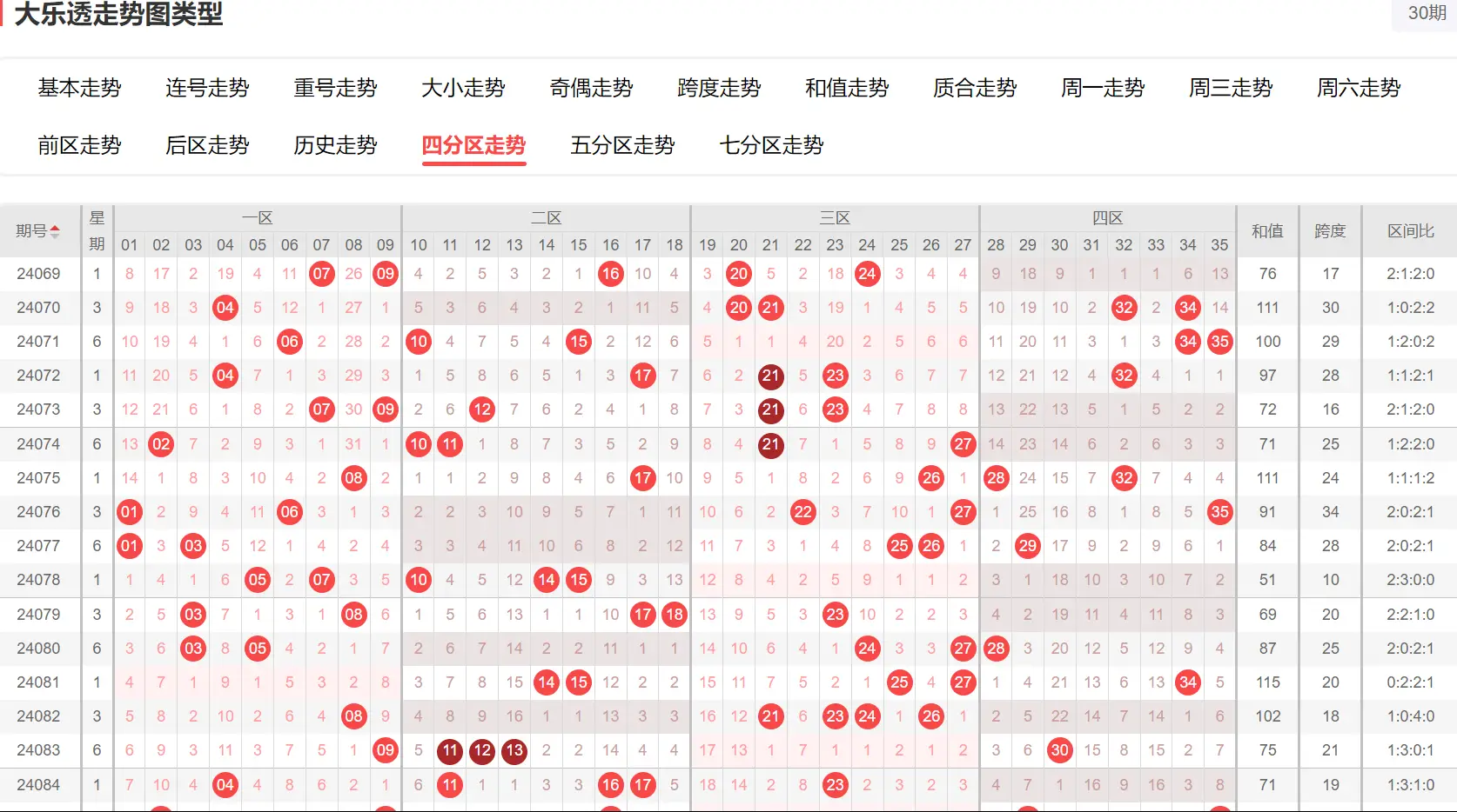 和值是指从所有开奖号码中取出的数字总和。对于大乐透来说,和值的范围通常在50至200之间。通过对历史开奖和值的趋势图分析,玩家可以发现和值的集中区间和波动规律。