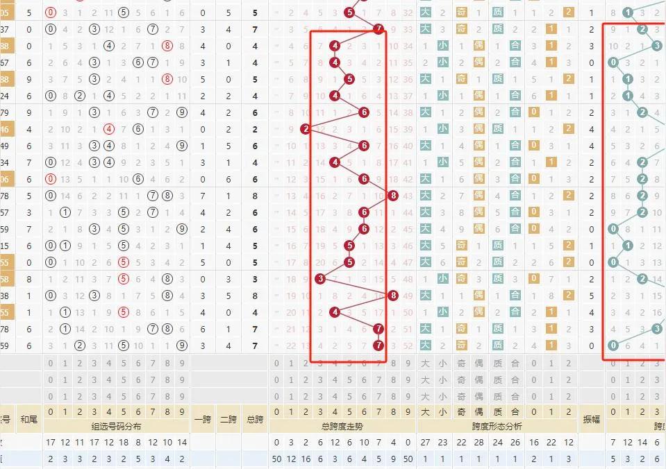 通过结合区间划分,玩家能够更清楚地识别出某些特定区间的号码出现的频率。例如,在某些期次中,跨度值较小(如5-10之间)的组合较为常见,玩家可以基于这种规律,在未来的选号中优先考虑这些区间